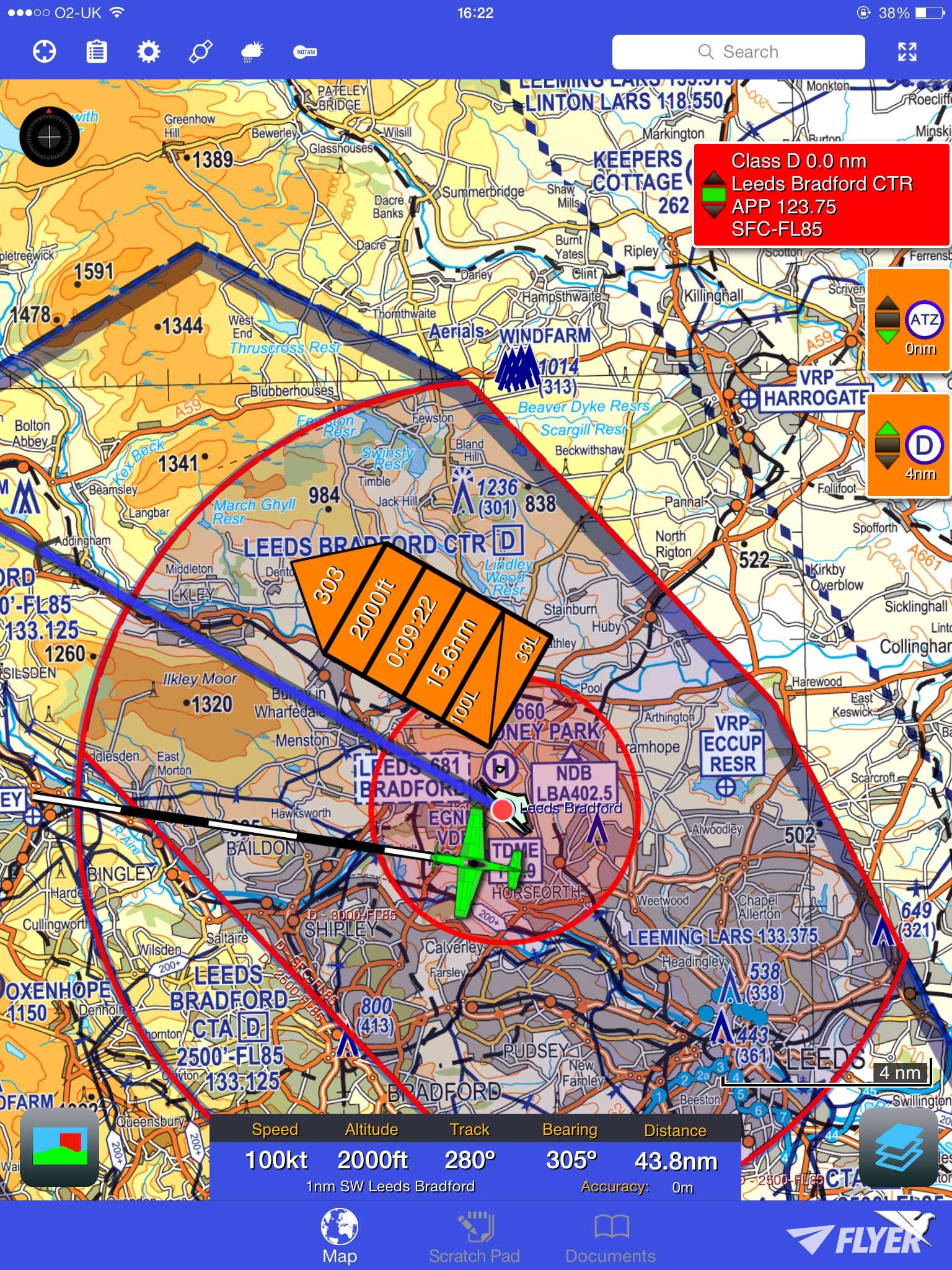 Basta con escribir un identificador OACI o el nombre del campo de aviación para configurar el destino. Podremos movernos por la pantalla sobre la ruta para evitar el espacio aéreo restringido. Planficación y navegación en un solo proceso.