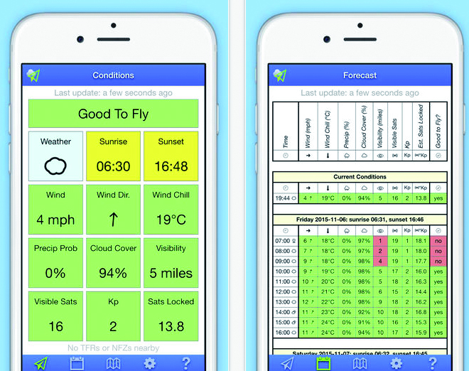 Aplicación gratuíta para iPhone / iPad. Muestra las condiciones locales del tiempo (temperatura en Celsius y Farenheit), velocidad del viento, dirección del viento, índice geomagnético kp, local, salida y puesta del sol… También contiene mapas de zonas de exclusión aérea para evitar volar aviones no tripulados en lugares prohibidos. Indica la situación de más de 5000 de los aeropuertos más importantes del mundo, el área militar de Estados Unidos y el Parque Nacional de Estados Unidos. Se puede personalizar la zona de exclusión aérea para mostrar un área diferente.