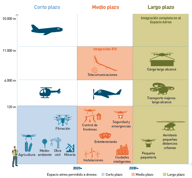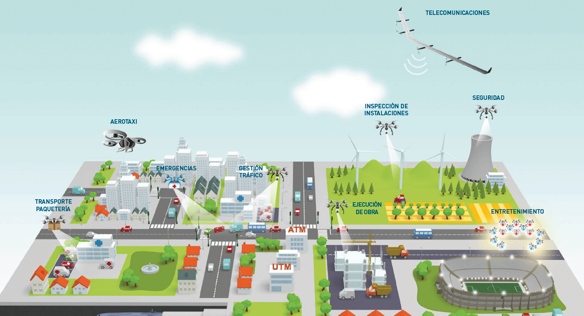 A día de hoy, los drones civiles actúan en zonas separadas de la aviación comercial. La intención es que a medio y largo plazo, se vayan incorporando a más zonas de actuación debido a los avances en los futuros usos que se prevén para los drones como, por ejemplo, aplicaciones urbanas específicas para para convertir nuestras ciudades en “inteligentes”. Por consiguiente, los drones terminarán compartiendo espacio aéreo con la aviación tradicional. Para poder hacerlo posible, será necesario tener el cuenta diversos factores como por ejemplo: una gestión eficiente del espectro radioeléctrico, adecuación del uso de los canales de comunicación para garantizar la seguridad, contar con seguros adecuados adaptados a los distintos tipos de servicios que se podrán prestar…