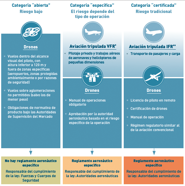 Con este Real Decreto por fin se veía al menos la posibilidad de solicitar permiso para volar en zonas urbanas, sobre aglomeraciones de personas y vuelos nocturnos. A día de hoy se es consciente de que uno de los principales retos que debe afrontar Europa para el desarrollo de este segmento de actividad es la armonización de los marcos normativos de los Estados Miembros. En este sentido, la Agencia Europea de Seguridad Aérea (EASA) está realizando un notable esfuerzo para establecer reglas comunes para la operación profesional y recreativa de drones dentro del territorio europeo. España está trabajando con la UE para definir un nuevo marco con reglas comunes para los miembros de la Unión, que favorezca el intercambio de bienes y servicios. Para ello, se está desarrollando una nueva norma comunitaria que será categorizada en función del riesgo de la actividad a llevar a cabo.